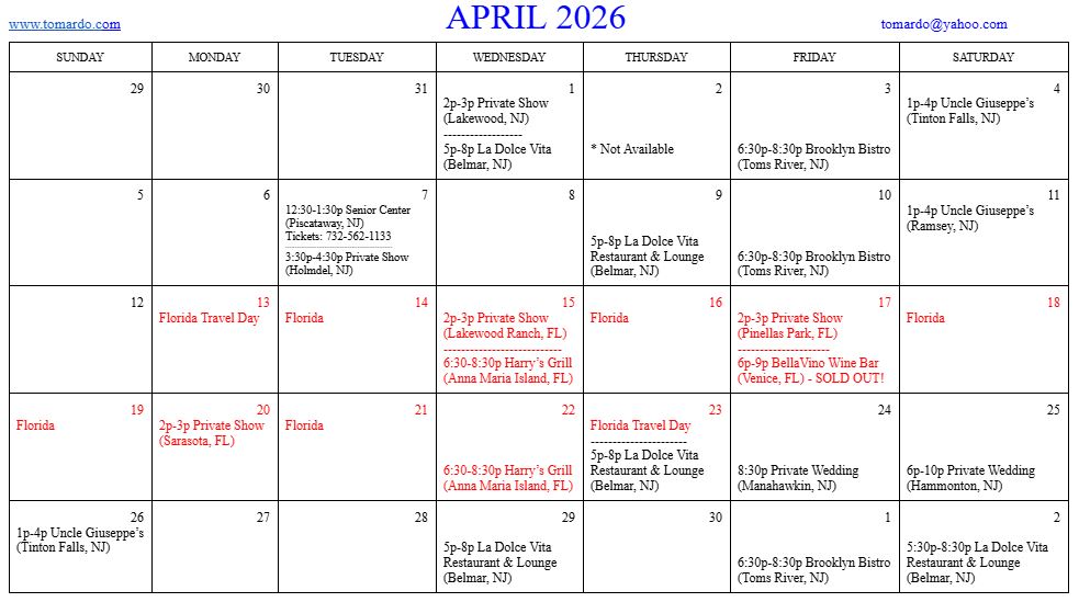 * Stuff happens… The schedule changes… ALWAYS call the venue to confirm that Tomardo is performing before coming out!