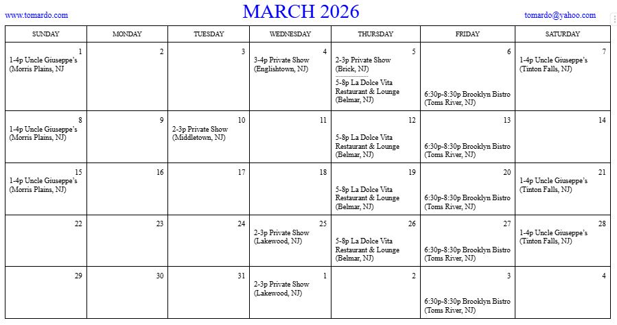 “Tomardo” is a full-time musician carrying on the tradition of legendary entertainers with a style and charm uniquely his own. He has a knack for sounding just like the many artists he sings. You’ve seen him at the casinos, on cruise ships, in restaurants, and for countless private events from New Jersey to Florida!